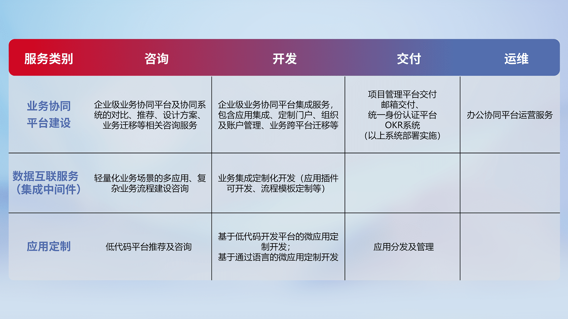 针对钉钉、、企微、、IDaas等平台级产品提供产品的规划、、、、方案、、交付、、、定制化开发等服务,,实现如统一协同办公、、智能客户服务、、、、混合会议管理、、智能数据查询、、、等业务场景,,,,实现数字化转型。。