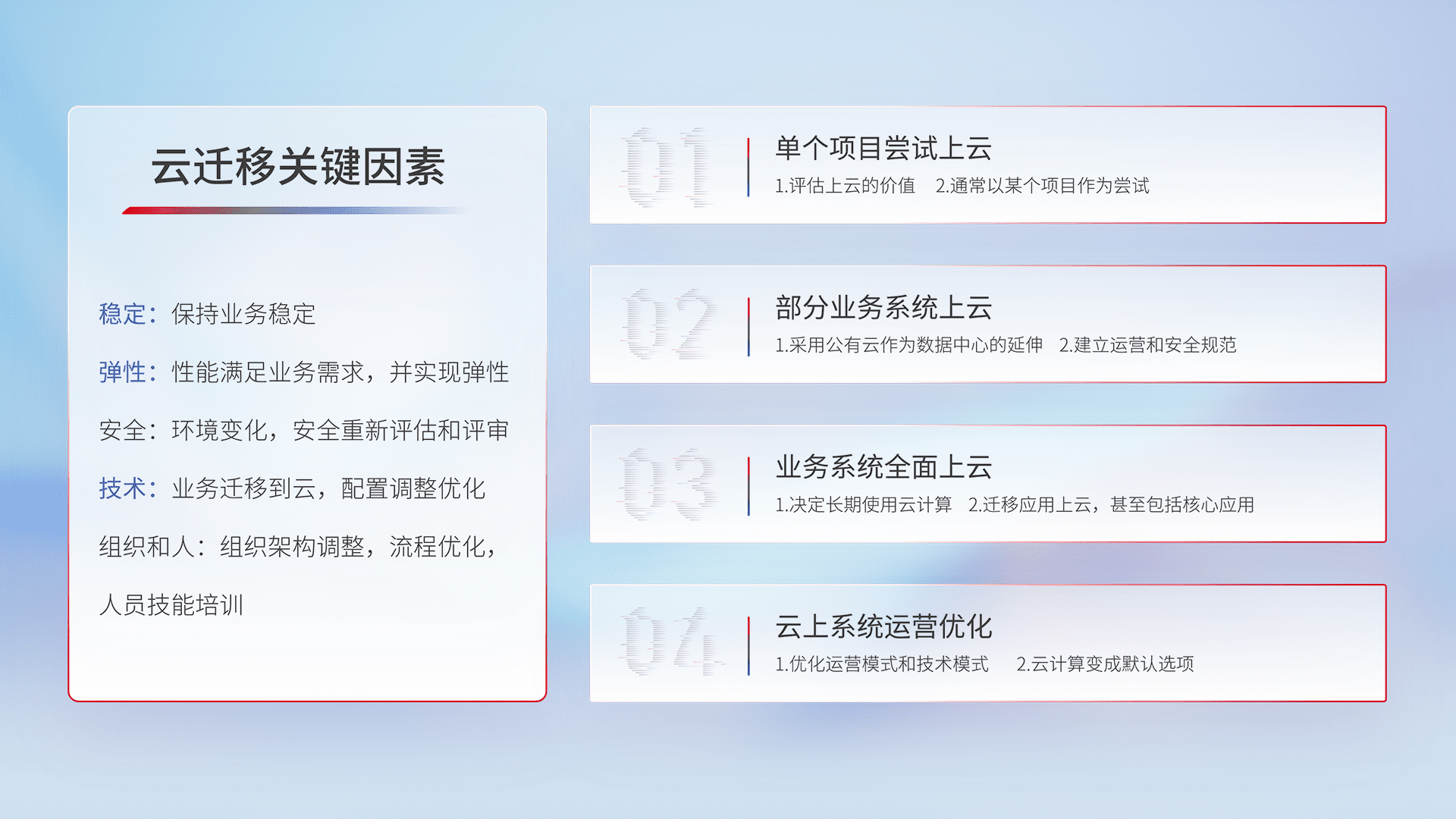 结合实际业务,,,从规划设计、、、、云平台选型、、、、云原生改造、、、、数据迁移、、、集成交付,,,迁移全过程为客户识别最佳上云路径,,,做好风险识别管理,,设计网络架构、、身份权限、、、、安全审计合规、、、操作审计、、、、日志审计、、、监控告警策略、、、多站点容灾设计等,,对云上基础设施进行整体规划,,提升IT治理水平,,,以满足弹性、、、、高可用、、高性能的需求。。。。